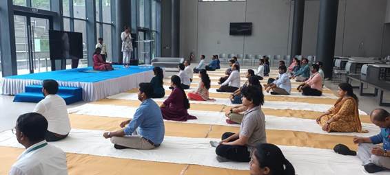 In the fast-paced corporate world, the pressures and demands of daily work often take a toll on employees’ physical and mental well-being. Recognizing this, a session was conducted at Bharat Biotech for their dedicated staff, focused on releasing tension and restoring energy. The theme of the session was to explore how yoga can help individuals regain balance, ease stress, and promote overall wellness.